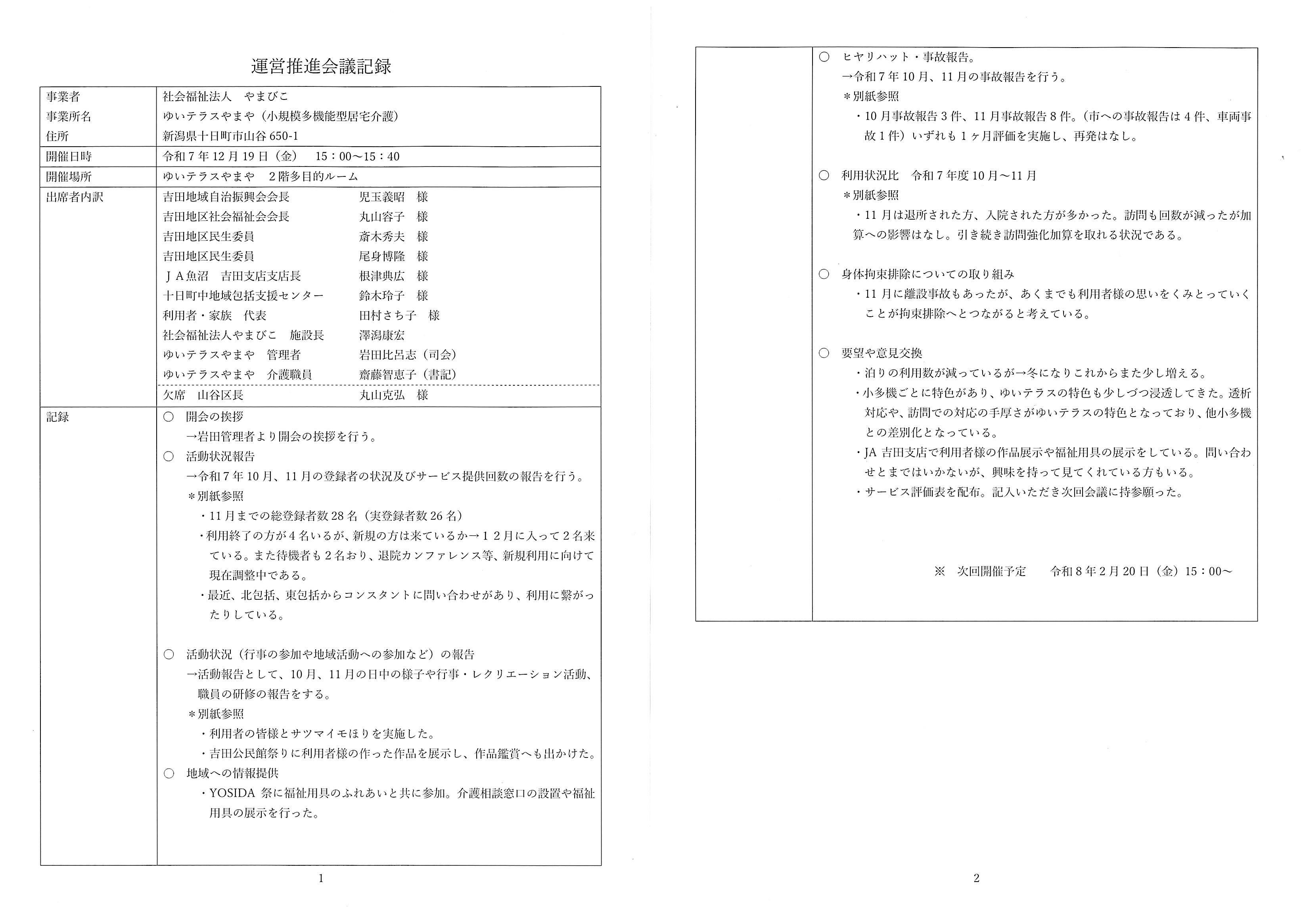 ゆいテラスやまや(小多機)運営推進会議記録